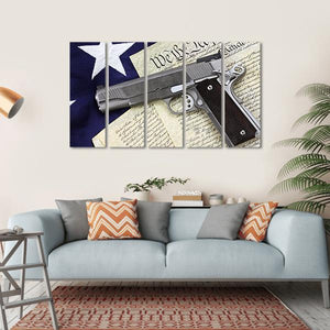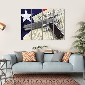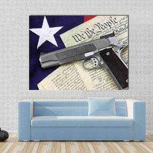 Featuring a striking handgun alongside the American flag, this artwork evokes a sense of patriotism. The vintage style combined with the historical elements creates a meaningful decor piece that celebrates American values.
