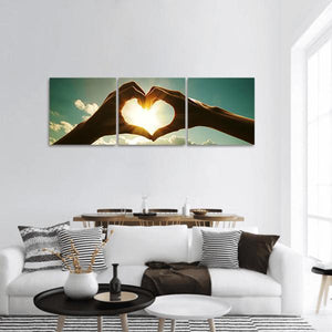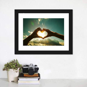 Hands Showing Love captures hands forming a heart with sunlight streaming through the center against a blue sky and soft clouds. The photorealistic image reads warm, hopeful and peaceful. It suits modern living spaces and pairs well with blue-and-gold accents.