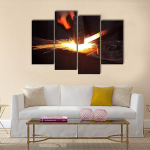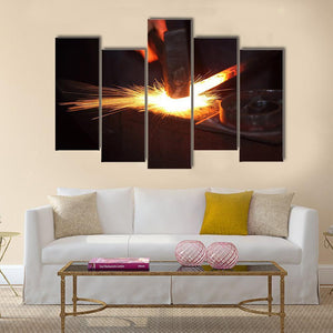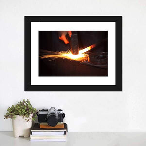 A close-up view of a blacksmith’s hands striking glowing steel with a hammer, captured as many small sparks fly. Rendered in warm orange, yellow, brown and deep black tones, the image feels intense and fiery—well suited to industrial or rustic rooms and modern room decor.