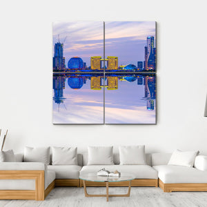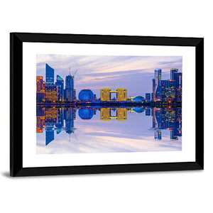 This modern cityscape showcases the vibrant skyline of Hangzhou at night, featuring sleek skyscrapers, a spherical building, and calm water reflections. Its palette of blue, yellow, and purple creates a futuristic yet serene atmosphere, making it a perfect addition to any contemporary space.