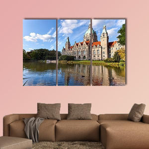 This photorealistic canvas captures Hanover City Hall—its domed silhouette reflected in a calm lake, framed by trees and a cloudy sky. The blue, green and brown palette creates a bright, scenic, and peaceful mood that works well in living rooms or entryways.