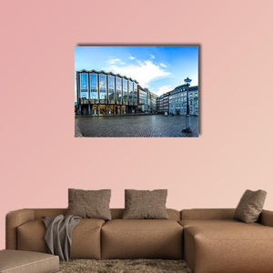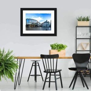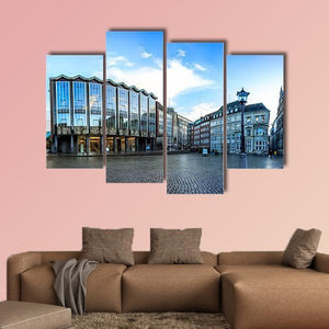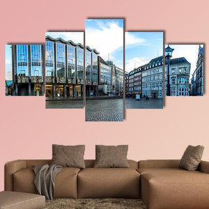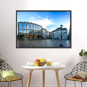 Hanseatic City, Germany — a photorealistic cityscape of modern and historic buildings captured in a wide-angle, eye-level view. Muted blues, grays, browns and white bring out a cobblestone square, a street light and details like a wavy roofline and arched windows; the image suits modern home interiors and general room decor.
