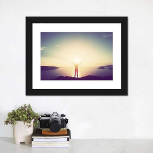 Woman On Cliff features a lone person standing on a seaside cliff at sunset, a silhouetted figure with arms raised against purple, yellow, blue and orange skies. The photographic, modern landscape uses a rule-of-thirds composition to feel serene, optimistic and triumphant, and it works well as home wall decor in modern rooms.