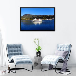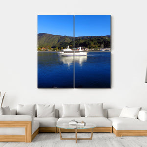 Capture the serene beauty of Picton, New Zealand with this canvas wall art. A white motor yacht rests on calm blue waters, framed by lush green forests and majestic mountains. This piece exudes a peaceful vibe, making it a charming addition to any space.