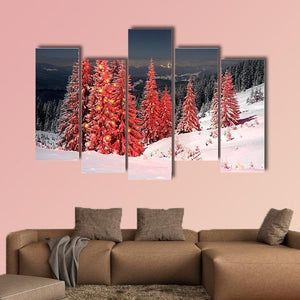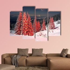 Mount Kukul In Winter depicts snow-dusted trees and distant mountains beneath a crescent moon, with trees decorated with gold ornaments and a red, white, blue and gold palette. The image reads as a vibrant, whimsical winter evening with a quietly festive, magical mood. It suits modern room decor or seasonal displays.