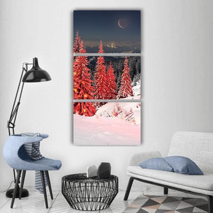Snowy mountain landscape with red pine trees and a crescent moon, lit by warm lights and a soft pink glow on the snow for a magical, serene winter atmosphere. The dramatic, vibrant palette of red, white, dark blue, gray, and yellow complements modern room decor and living spaces.