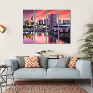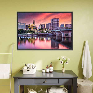 This canvas wall art captures the stunning skyline of Hartford, showcasing the city's iconic architecture against a vibrant sunset. The serene reflections in the river enhance the peaceful atmosphere, making it an ideal piece for any modern décor.