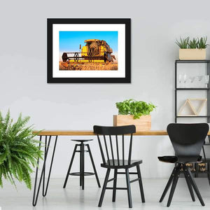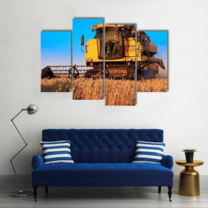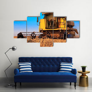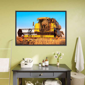 Harvest Time Canvas Wall Art shows a combine harvester moving through a golden wheat field, captured from a low-angle view with the driver visible in the cab. Warm yellow, blue, gold and brown tones create a harvesting, rustic mood that suits rustic or nature-themed rooms.