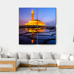 This artwork captures the serene beauty of the Hassan II Mosque at night in Morocco. Featuring a majestic illuminated minaret reflected in tranquil water puddles, it evokes a calm atmosphere perfect for enhancing your space.