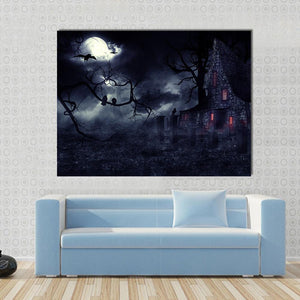 This haunting canvas depicts a spooky house under a full moon, shrouded in a foggy atmosphere. Silhouetted birds and bare tree branches enhance the eerie mood, making it a perfect addition to any gothic or horror-themed décor.