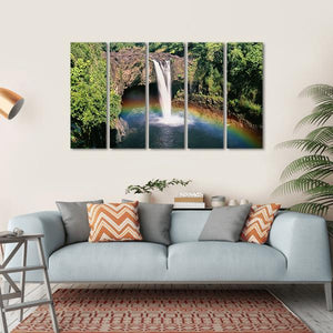 This canvas art captures the serene beauty of Hawaii's Rainbow Falls, featuring a stunning waterfall framed by lush foliage and rocks. The vibrant palette of greens, blues, and earth tones brings a natural and majestic atmosphere to your space.