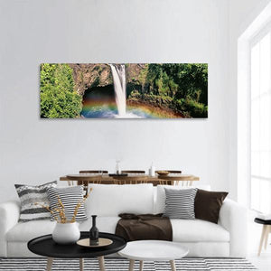 Hawaii Rainbow Falls Panoramic Canvas shows a wide photographic view of a waterfall and a visible double rainbow set among lush tropical greenery. The scene feels serene and vibrant, with greens, browns, blues and warm rainbow tones. Suits modern or nature-themed rooms looking for a calming landscape image.