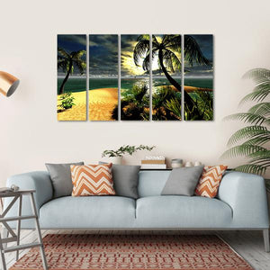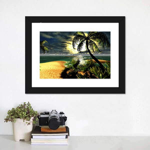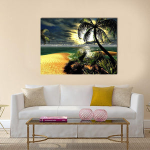 This canvas artwork captures a serene tropical beach at sunset, featuring palm trees, ocean waves, and dramatic stormy skies. The vivid colors of green, blue, and yellow create a lively atmosphere, perfect for bringing a touch of nature to your wall decor.