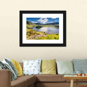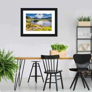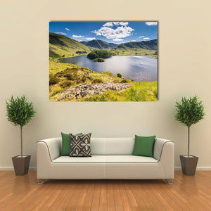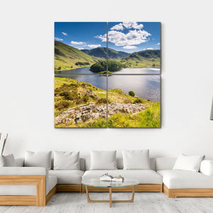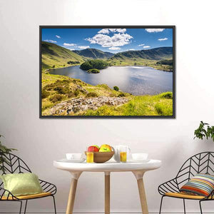 This canvas art beautifully captures the serene landscape of Haweswater, showcasing a tranquil lake surrounded by lush hills and a bright sky dotted with fluffy clouds. The harmonious blue and green palette creates a peaceful atmosphere, perfect for enhancing your wall decor.