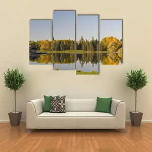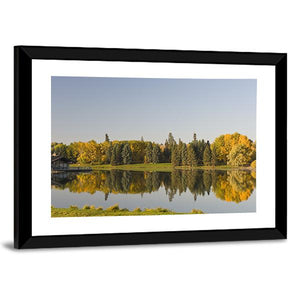 This realistic landscape print shows Hawrelak Park in Edmonton, Alberta, with a calm lake, trees in autumn foliage, and a clear sky mirrored in still water. Soft blues, greens and warm fall yellows give the scene a peaceful, serene mood that works well in a quiet living room or entryway.