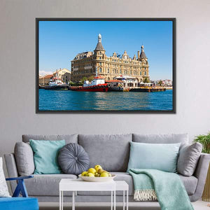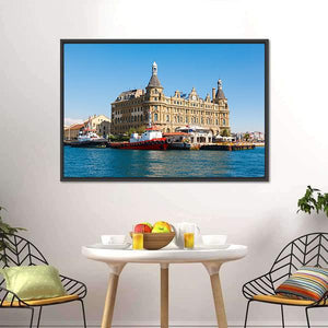 Celebrate the vibrant charm of Istanbul with our Haydarpasa Train Station canvas art. This stunning piece captures the historic architecture, boats, and waterfront in a photorealistic style, showcasing a lively palette of blue, beige, red, and white.