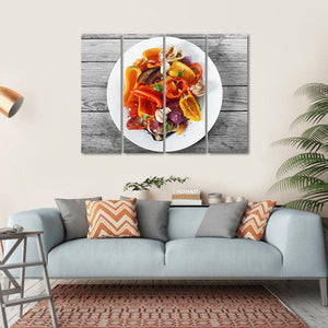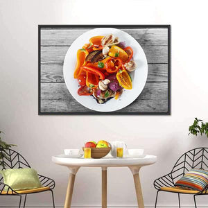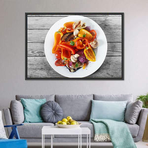 This canvas features a vibrant overhead view of a plate filled with roasted vegetables, including peppers, mushrooms, onions, and tomatoes. The fresh and appetizing colors of red, orange, yellow, and purple will add a touch of healthy charm to any kitchen or dining area.