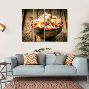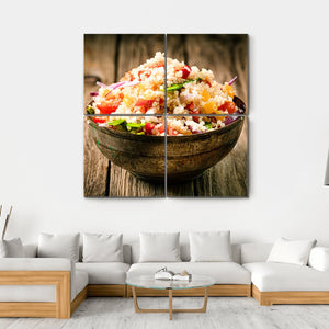 Bring the essence of rustic charm to your space with this beautiful canvas featuring a close-up of a quinoa salad in a decorative metal bowl. The warm palette of beige, red, green, and brown creates an appetizing and fresh atmosphere, perfect for any kitchen or dining area.