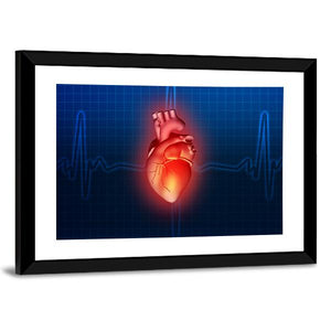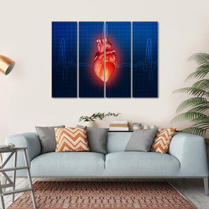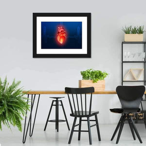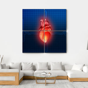 This canvas print features a vibrant illustration of a glowing red heart, complemented by an ECG line and a blue grid background. It brings a modern, scientific touch to any space, making it ideal for medical offices or contemporary decor.