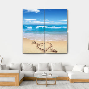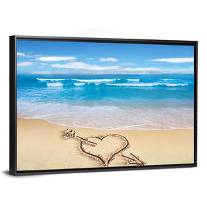 This serene canvas art depicts a romantic scene of a beach with a heart drawn in the sand. Gentle waves kiss the shore beneath a clear blue sky, creating a calming atmosphere perfect for any space.
