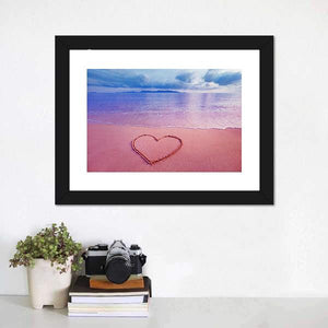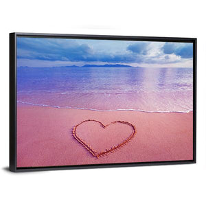 A pink heart drawn in the sand rests beside gentle waves, set in soft pink, purple, and white tones. The scene feels romantic, peaceful, and serene. Its minimalist, modern style suits modern or minimalist rooms and romantic spaces.