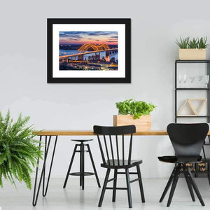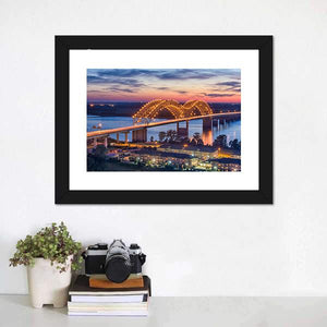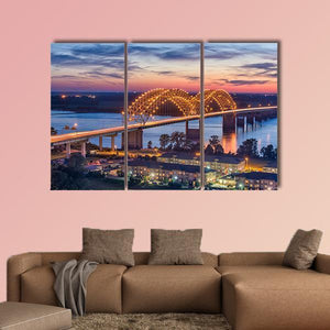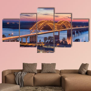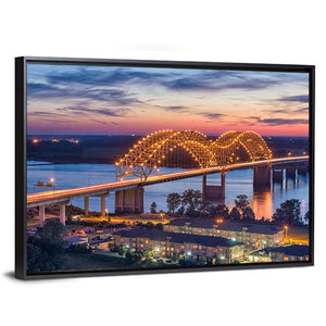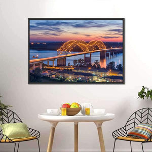 This canvas depicts the Hernando De Soto Bridge at dusk, the arched span lit and mirrored in the river below. Rendered in a realistic style using orange, blue, pink, yellow and brown tones, it creates a peaceful, atmospheric cityscape suited to modern living rooms or home offices.