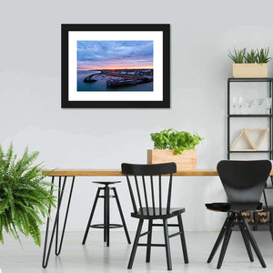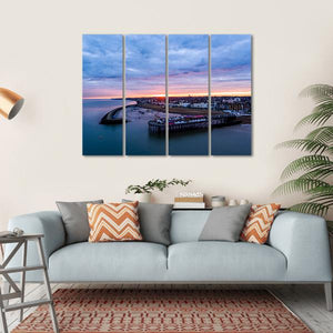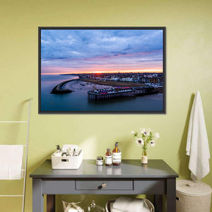 This photorealistic canvas art captures the serene beauty of Herne Bay Pier at sunrise. Featuring a tranquil palette of blue, pink, and orange, it showcases stormy clouds, boats in the water, and the coastal town. It's a lovely addition for any wall decor.