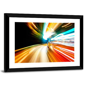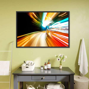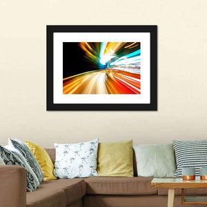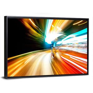 This abstract artwork captures the dynamic movement of light streaks and motion blur, reflecting an energetic and futuristic atmosphere. With its vibrant palette of orange, yellow, blue, and black, it’s perfect for adding a modern touch to your space.