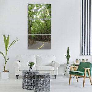 A photographic canvas print of a winding highway through a lush Philippine forest, with dense trees framing the curved road and a yellow center line drawing the eye into the distance. The scene feels serene and inviting—greens and muted greys create a natural, calming mood that suits modern room decor, hallways, or travel-inspired spaces.