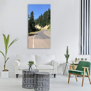A landscape showing a paved highway cutting through a dense green forest with distant mountains under a clear daytime sky. The realistic composition uses depth and rule-of-thirds balance, with blue, green, grey, yellow and white tones to create a peaceful, scenic, adventurous mood — suited to modern living rooms or travel-themed spaces.