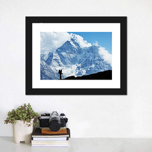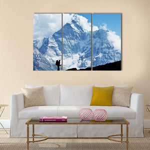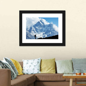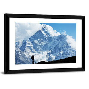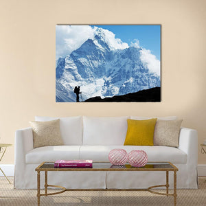 This piece captures the silhouette of a mountain climber against the awe-inspiring backdrop of snowy mountains and clouds. Its serene colors of blue, white, and grey evoke a sense of adventure and tranquility, making it a perfect accent for any nature-inspired décor.