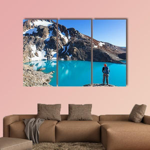 Hike In Patagonia places a hiker on a rock beside a vibrant turquoise mountain lake, with rugged, snow-patched peaks rising in the background. The realistic landscape follows a rule-of-thirds composition and carries a serene, adventurous mood. Pairs well with modern, nature-focused rooms such as living areas or entryways.