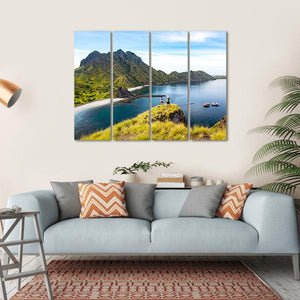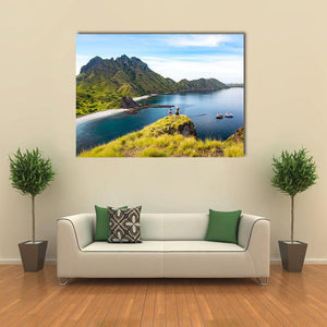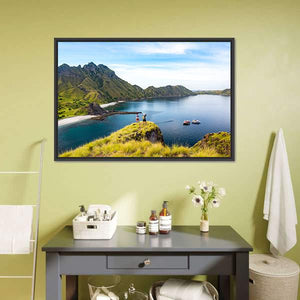 This captivating canvas art features two hikers standing on the edge of a cliff, taking in an expansive coastal view. The serene palette of greens and blues captures the adventurous spirit of nature, making it an inspiring addition to your wall decor.