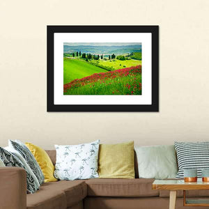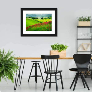 This beautiful canvas showcases the rolling hills of Tuscany, adorned with vibrant red flowers and elegant cypress trees. The idyllic scene evokes a sense of peace and tranquility, making it a perfect addition to your home.
