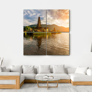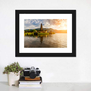 This serene canvas art features a pagoda-style temple reflected on the calm waters of Bratan Lake, framed by lush mountains under a dramatic sunset sky. Its warm colors and realistic details create a tranquil atmosphere, making it a lovely addition to nature-themed decor.