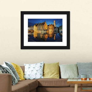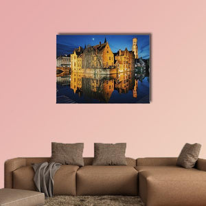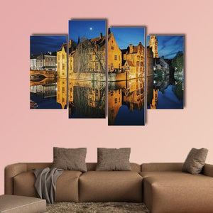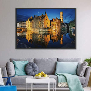 A realistic cityscape of Brugge’s historic center, showing illuminated buildings and a bell tower reflected in a calm canal beneath the moon. Muted blues, warm golds and browns give the scene a historic, serene, picturesque mood that suits both classic and modern interiors.