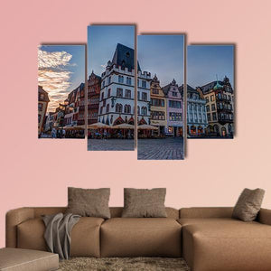 A realistic cityscape of European house facades at the main market in Trier, showing gabled roofs, arched windows and umbrellas over cafe tables. Daytime light and a palette of brown, blue, orange and gray create a vibrant, inviting architectural scene that suits living rooms or dining areas with modern or classic decor.