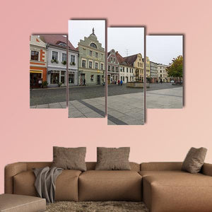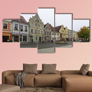 A realistic cityscape of architecture and a town square, featuring a row of colorful historic buildings, a paved square and a fountain. Rendered in earth tones with gray, white and red accents, the print conveys a quiet, historic mood and suits room decor in living rooms, studies, or hallways.