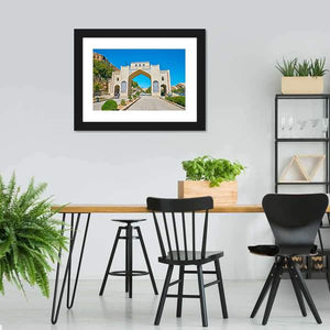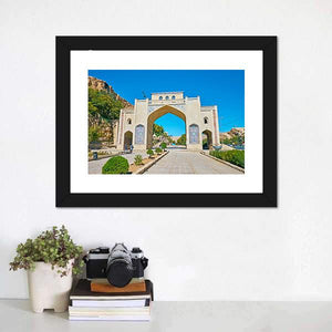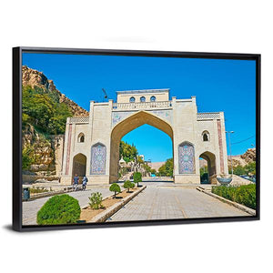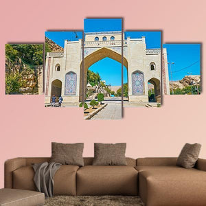 Quran Gate in Iran depicts an ancient arched gateway with ornate blue tilework and a courtyard seen through the arch, with foliage at the edges. The centered symmetry and leading lines give a grand, historical, serene feel, making it a calm focal point for home walls and room decor.