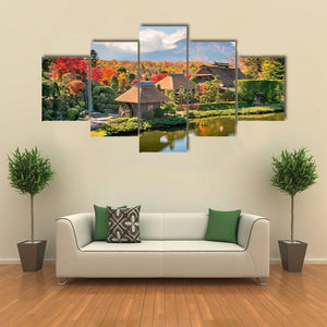 A realistic landscape centered on Mt Fuji, this print shows thatched-roof farmhouses, vivid autumn foliage, and a calm lake reflecting the scene. The rule-of-thirds composition and layered depth create a serene, picturesque mood. It fits nature-inspired or modern room decor.