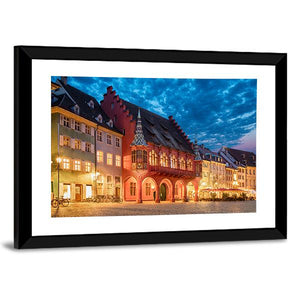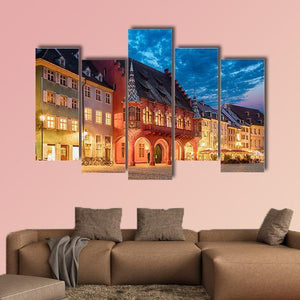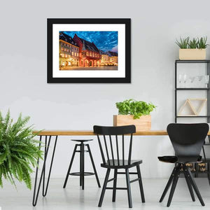 This photographic cityscape depicts historic buildings around a town square, with ornate facades and glowing windows beneath a dramatic twilight sky. Warm orange and cool blue tones create a vibrant, historic mood that suits modern or traditional living spaces and city-themed rooms.