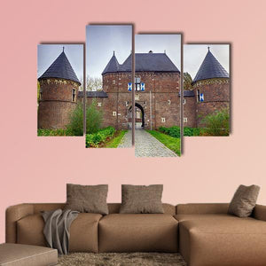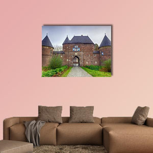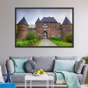 Castle In Vondern is a realistic canvas print of a symmetrical castle scene featuring an arched gateway, towers, a moat and a stone pathway. Muted browns, greens, greys and whites create a historic, imposing mood, with pointed roofs and blue window accents adding subtle detail. The piece pairs well with neutral, earthy interiors and modern canvas collections for room decor.