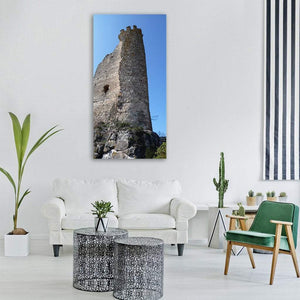 This canvas depicts a partially collapsed stone tower standing on a rocky outcrop beneath a clear blue sky, seen from a low angle. The image carries a historical, stark mood with a rustic, documentary feel that suits rustic or modern room decor.