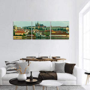 A realistic panoramic cityscape of the Vltava River, featuring a row of historic riverfront buildings and castle-like structures on a hill. Rendered in red, green, blue, yellow and white, the daytime scene feels serene and picturesque with calm water reflections. Suits modern interiors and city-inspired room decor.