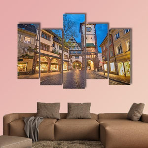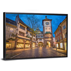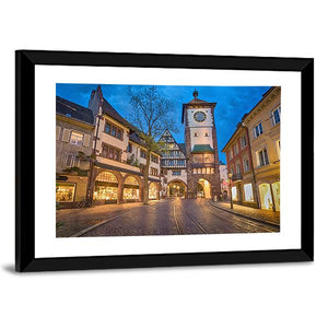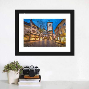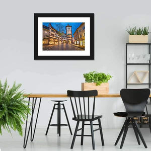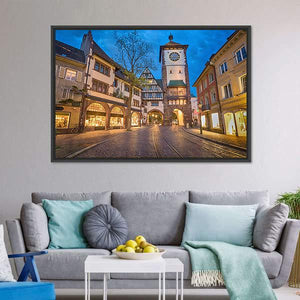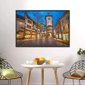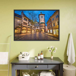 City Gate At Dusk, Germany presents a realistic cityscape with a cobblestone street, buildings and a clock tower. Soft blues and browns with warm yellow-lit windows create a quiet evening ambiance. A good match for modern interiors and room decor that favor architectural detail.