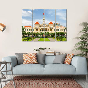 This canvas captures the grand and historic cityscape of Ho Chi Minh City Hall, featuring a stunning government building framed by lush trees and a vibrant flag. The symmetry in its composition, combined with a rich palette of yellow, red, and blue, makes it a striking addition to any space.