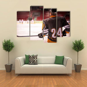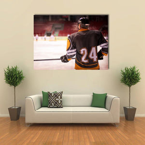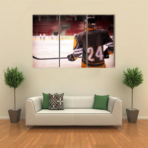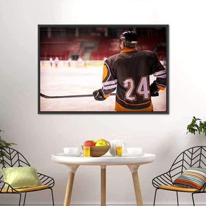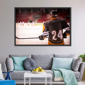 This striking canvas features a close-up of an athletic hockey player wearing jersey number 24, intensely focused and holding a hockey stick. The artwork’s bold palette of black, orange, and white adds a determined spirit, making it a fitting piece for sports enthusiasts.