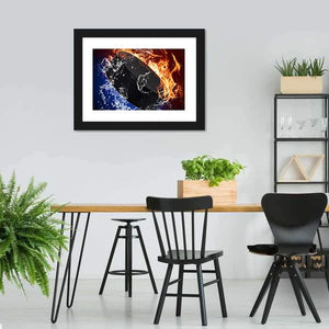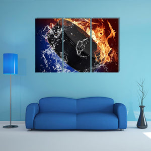 Hockey puck locked in flames and splashing water sets an energetic, dramatic scene. Bold black, orange, blue, and white create high-contrast motion with flames licking the puck and water spraying around it. Suited to sports rooms or modern living spaces that favor dynamic, colorful wall art.