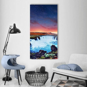 This canvas captures Godafoss waterfall beneath a starry night sky, with colorful clouds, rocky shores, and stretches of grass. Photorealistic blues, purples, whites and warm orange highlights create a serene, awe-inspiring mood that suits modern and nature-inspired rooms.