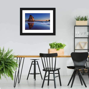 This captivating canvas art features a striking rock formation alongside the tranquil ocean and beach, evoking the serene beauty of New Zealand. The dramatic reflections in the wet sand are enhanced by a stunning sunset sky filled with blue and orange hues.